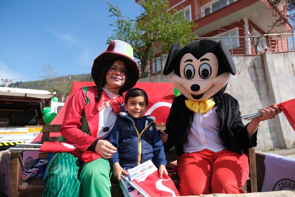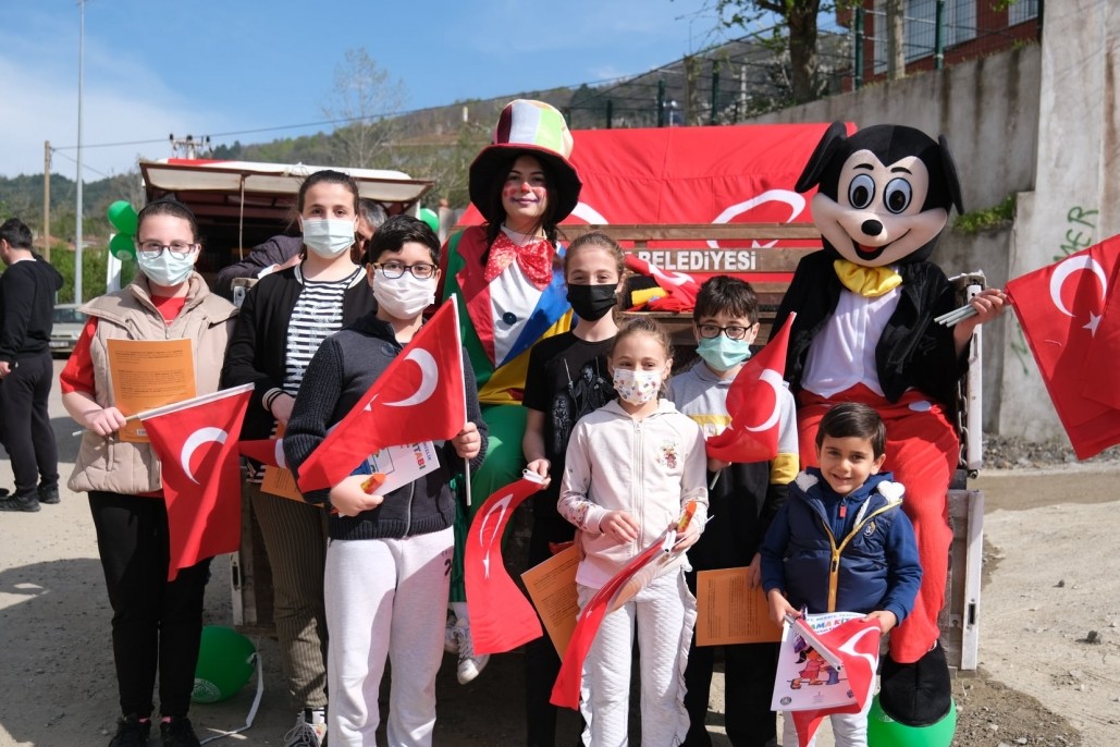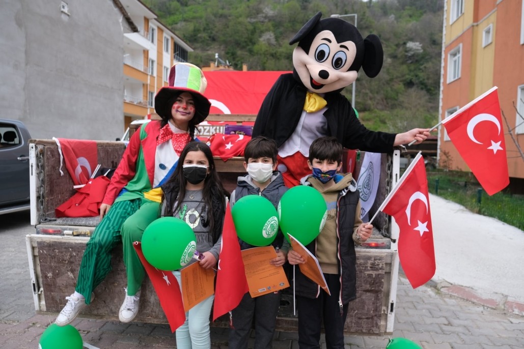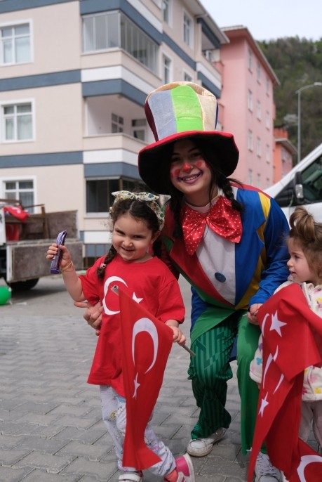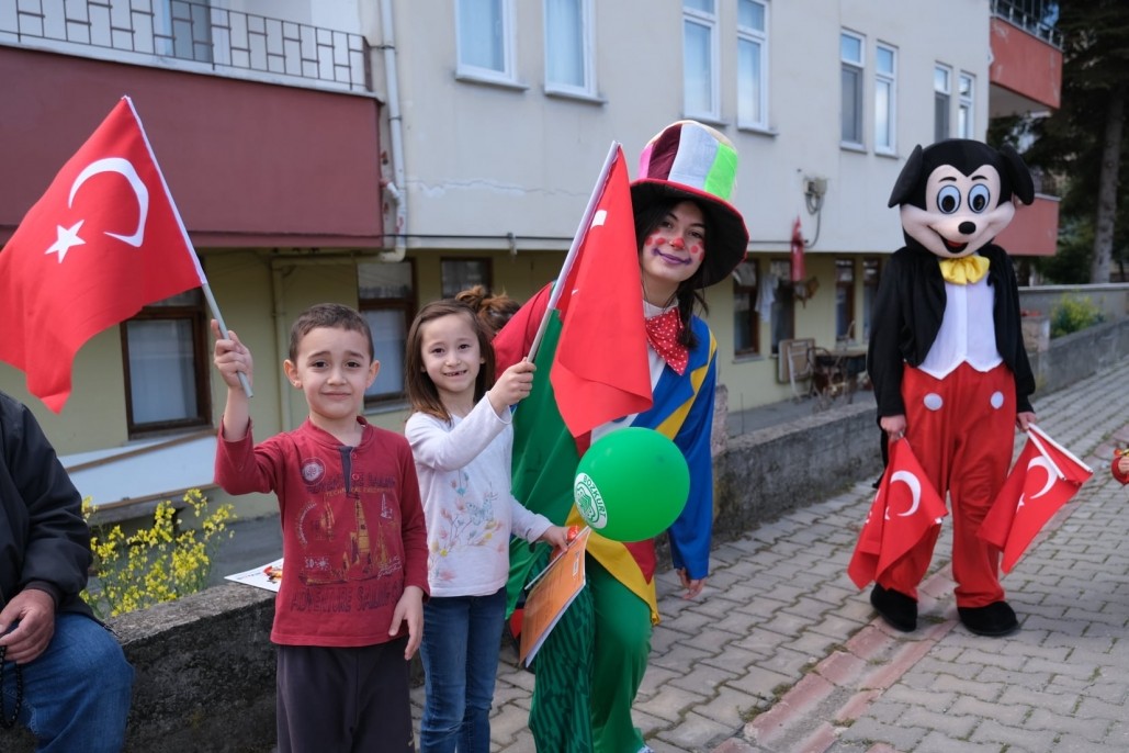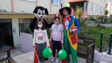 İlçemizde 23 Nisan coşkusunu çocuklarımızı sokak sokak palyaço ve Mickey Mouse eşliğinde ziyaret edip, hediyeler ve bayraklar dağıtarak yaşadık..