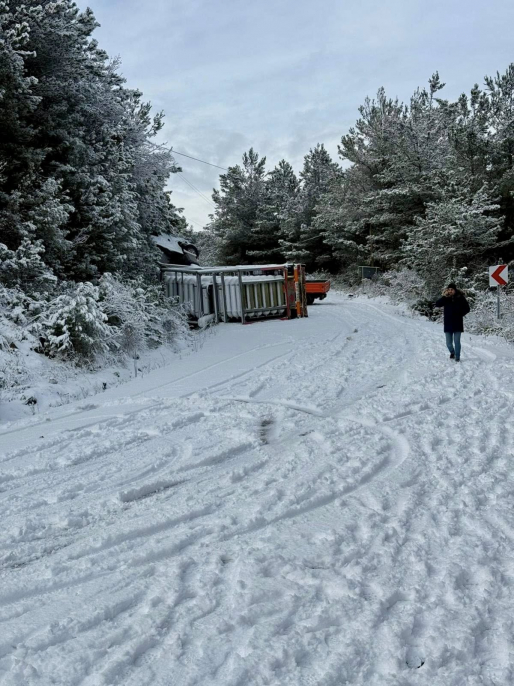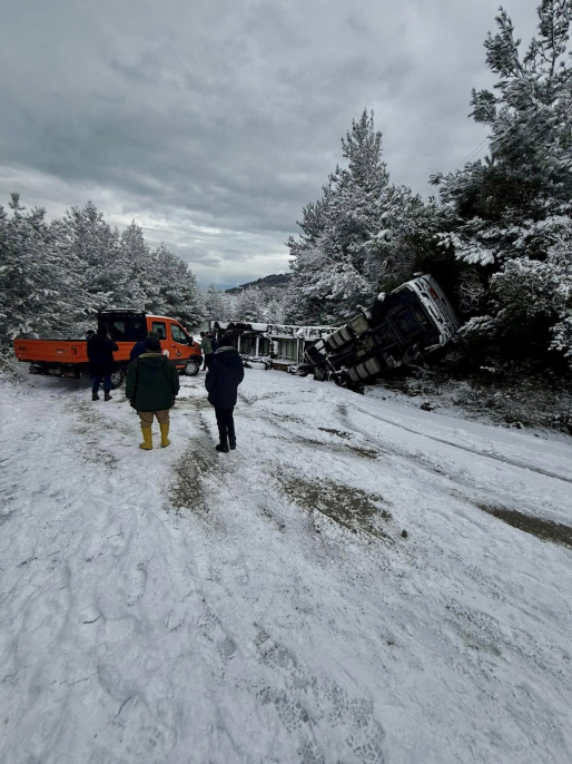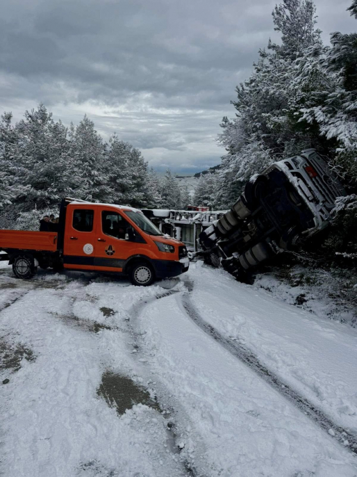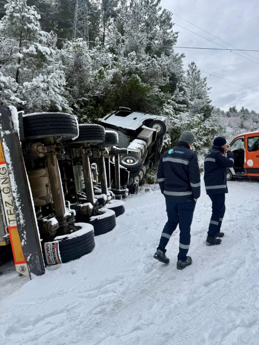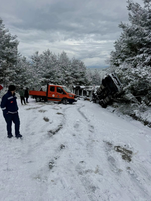 İlçemizin doğalgaz ihtiyacını karşılamak adına, zorlu kış şartlarında ve yoğun kar yağışında dahi yola çıkan doğalgaz tedarik aracı, kayganlaşan yol nedeniyle şarampole devrilmiştir.