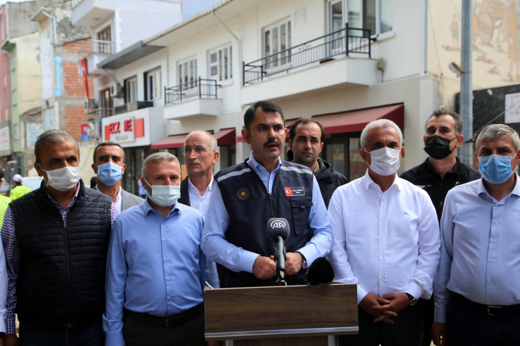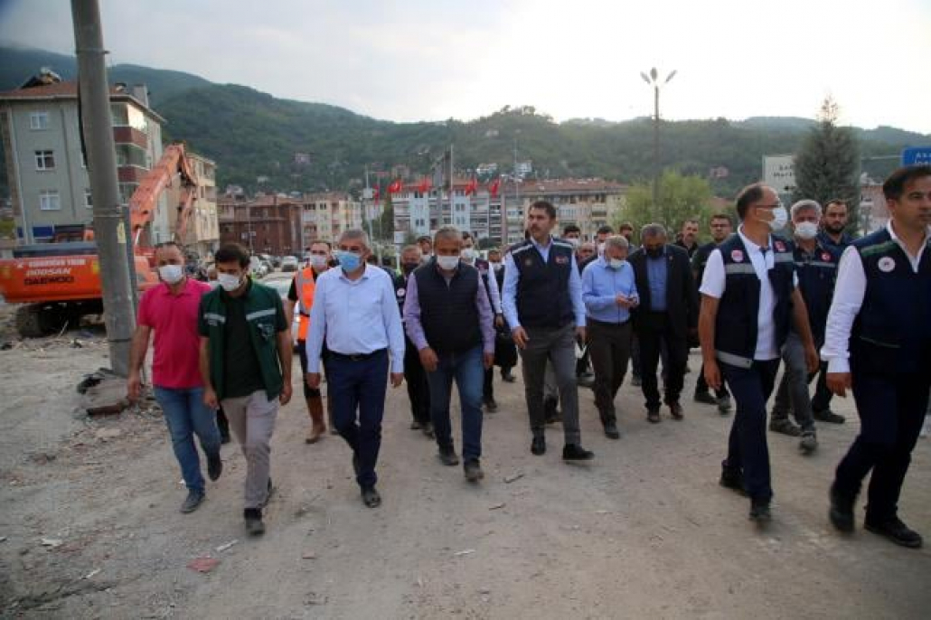 Bakan Kurum Bozkurt'ta esnafımızın ticari faaliyetlerini aralıksız sürdürebilmesi için konteynerlerle geçici iş yerleri oluşturduk, zarar gören ticari ünitelerin hasar tespitini tamamladık. TOKİ eliyle cephe yenileme, sokak sağlıklaştırma çalışmalarımızı gerçekleştirdiklerini ifade ederek, “İller Bankamız ve belediyemiz ile birlikte selden hasar gören; kanalizasyon, yağmur suyu ve içme suyu hatlarına ilişkin altyapı imalatlarımızı başlattık. 3 ay içerisinde ilçemizdeki altyapı çalışmalarının tamamını bitireceğiz” dedi.
